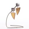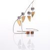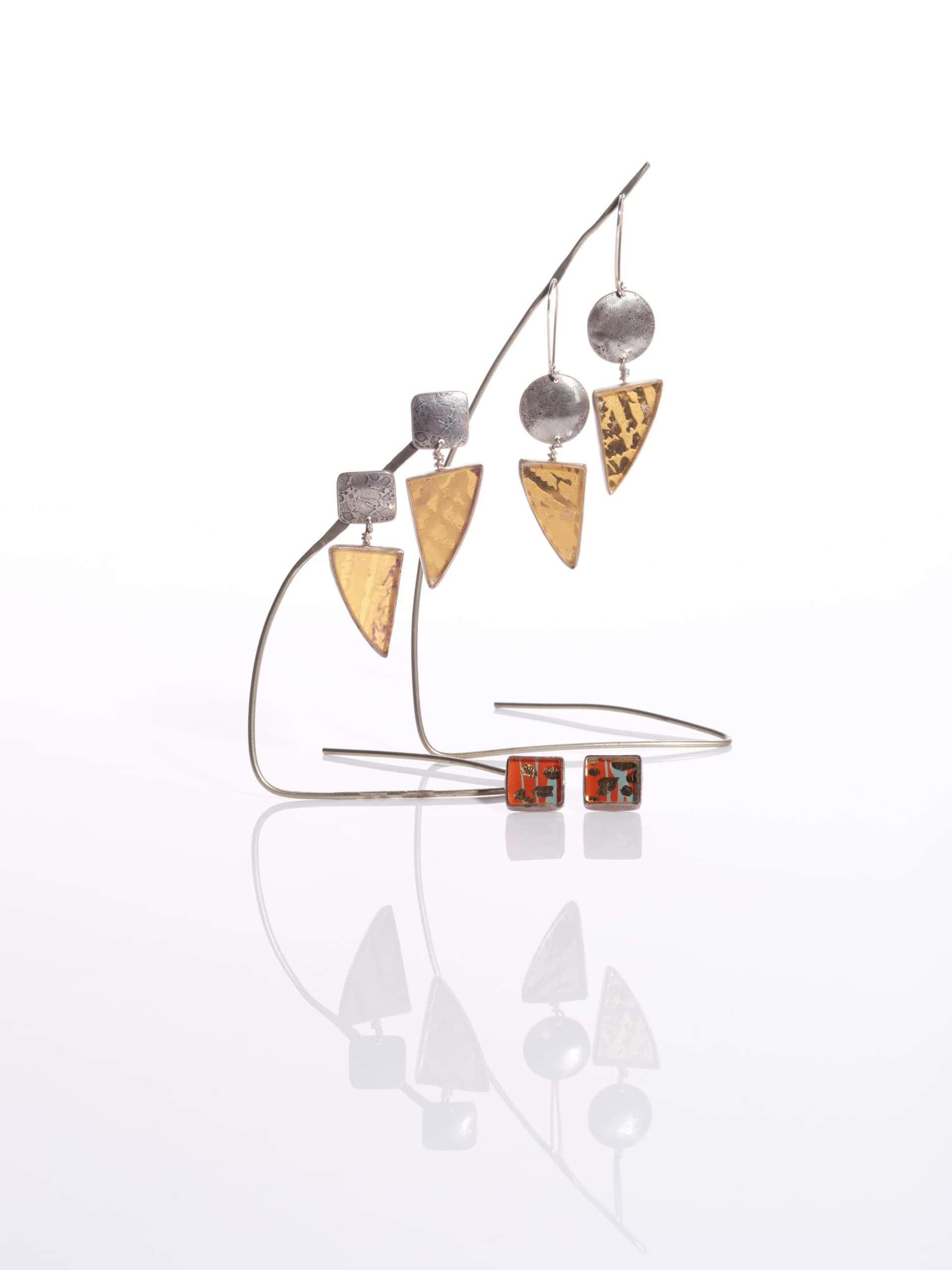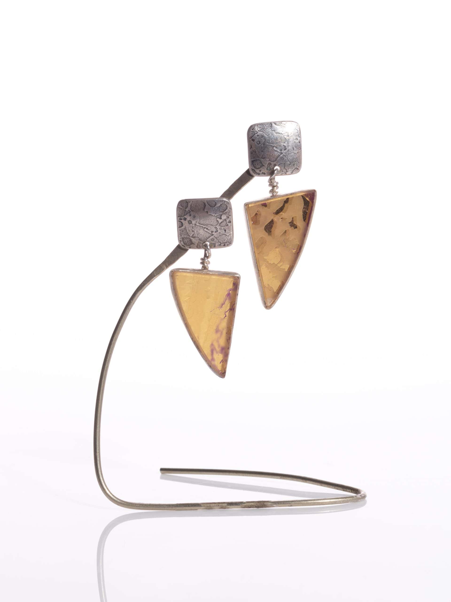 This piece draws its inspiration from the shifting light and luminous colour of the Welsh landscape. Created by Linda Norris in collaboration with jeweller Sara Lloyd Morris, these earrings combine artistry and craftsmanship in every detail. Each earring is formed from reverse-painted, sandblasted glass, delicately gilded with 24ct gold leaf to capture and reflect the light. The glass is set in eco silver and suspended from a square of richly textured reticulated fine silver, creating a harmonious balance of movement, texture, and glow.
